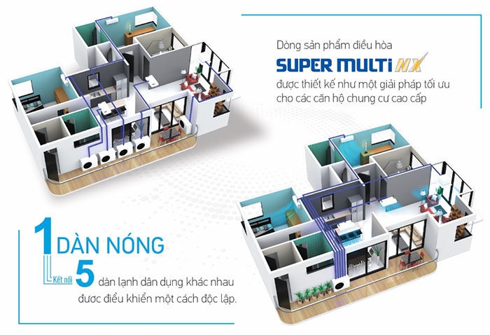 - Hệ multi Daikin có điều khiển thông minh: Dù Quý khách ở đâu, cũng có thể điều khiển máy điều hòa nhà mình chỉ bằng 1 vài thao tác đơn giản trên điện thoại hoặc máy tính bảng.
