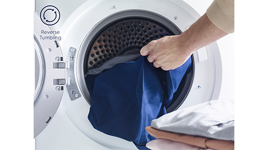 Chuyển động theo chiều kim đồng hồ và ngược chiều kim đồng hồ luân phiên giảm tình trạng rối và gây nhăn quần áo ít hơn 32%*. Điều này giúp quần áo không cần ủi nhiều, do vậy, quần áo sẽ mới lâu hơn. * Giảm nhăn 32% so với sấy khô trải phẳng - đã được thử nghiệm và chứng nhận bởi THTI