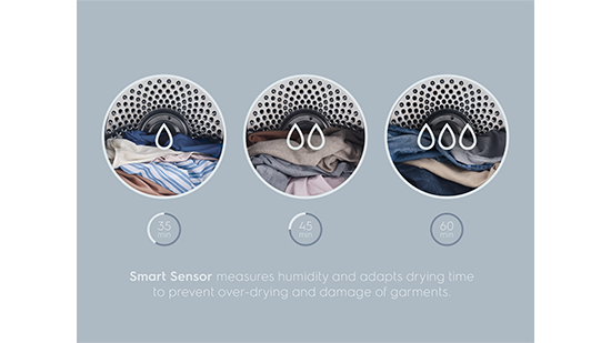 Cảm biến thông minh điều chỉnh thời gian sấy chính xác. Cảm biến về độ ẩm sẽ đảm bảo quần áo không bị sấy quá khô, khiến chất lượng sợi vải luôn được bảo vệ