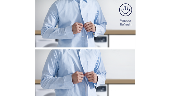 Làm mới và giảm nhăn nhanh chóng khi sử dụng Vapour Refresh. Chỉ với 15 phút, quần áo của bạn sẽ trở nên mềm, mượt, mới và giảm nhăn tới 18%* *Sử dụng Vapour Refresh và không sử dụng Vapour Refresh - đã được thử nghiệm và chứng nhận bởi THT.